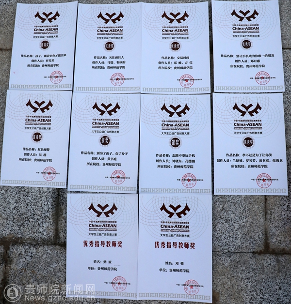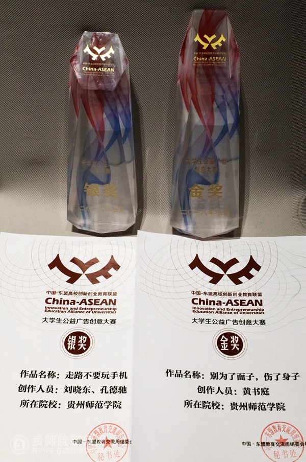 大赛共设金奖3项,银奖6项,铜奖11项,优秀奖72项。本次大赛我校共报送了数十件作品参赛,经过最终比赛,在东盟十一国的400多件作品中。我校美术与设计学院学生黄书庭同学获得金奖、刘晓东、孔德驰同学获得银奖,吴越等8名同学获优秀奖,教师邓鹭、樊亚获得优秀指导教师奖,贵州师范学院获得优秀组织奖,在参赛高校中名列前茅。