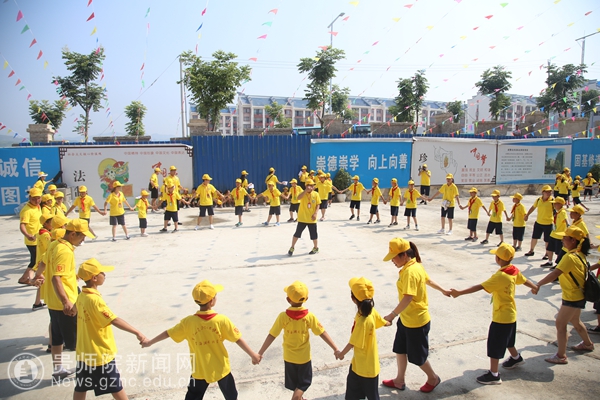 为深入贯彻落实习近平总书记等中央领导关于毕节试验区的重要批示和指示精神——“要为人民做实事”,积极支持和帮助毕节教育、文化等事业发展,在毕节试验区成立30周年之际,贵州师范学院创新大学生三下乡社会实践活动,第七次携手毕节市人民政府、贵州省陶行知教育思想研究会(以下简称“贵陶会”)、浙江省陶行知研究会(以下简称“浙陶会”)、长江平民教育基金会走进毕节市的教育、文化、交通等重点建设核心区域——金海湖新区,共同实施2018“美丽心灵,快乐同行”关爱阳光少年夏令营项目。活动中,贵州师范学院团委、教务处、民盟贵州师范学院支部、贵州师范学院各学院汇聚力量,谱写师院青年三下乡行知行的赞歌。