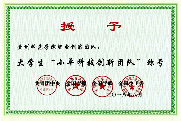 今年全省高校仅两支团队获此殊荣,我校“智电创客”团队成立于2011年,在校团委、物电学院的领导下,在社团指导老师杜宏博、谭韬、刘世华的精心指导下,团队从创立以来始终以严谨认真的科研态度和求实创新的探究精神从事大学生创新创业竞赛和学科竞赛,学生的创新创业意识、创新创业思维和创新创业精神得到大幅提升,运用知识解决问题、将知识转化为财富的创业能力得到显著增强,涌现出“2017年中国电信天翼奖学金”、“2017年中国大学生十大人物候选人”等一批创新创业典型学生案例。成果产生了广泛和强烈的社会反响,得到各级领导和有关部门领导的高度评价。中央电视台、新华社、光明日报、中国教育报、贵州电视台、贵州日报等中央、行业和地方媒体多次跟踪报道,全国50多家单位到校考察。团队自成立以来获得省级以上竞赛荣誉39项,国家级竞赛荣誉10项,国际级荣誉1项。竞赛涉及“互联网+”大学生创新创业大赛、“挑战杯”全国大学生课外学术作品竞赛、“微软创新杯”、“创青春”、全国大学生电子设计竞赛、全国机器人大赛等赛事。其中“互联网+”、“创青春”、“微软创新杯”均为我省最好成绩。