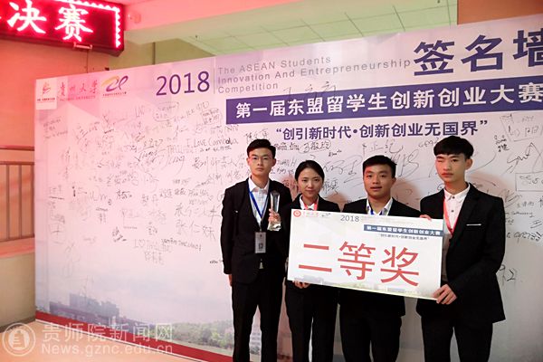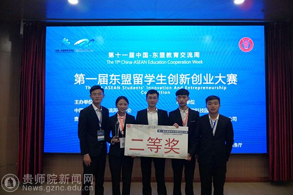 本网讯 为增强中国和东盟新青年之间的交流,切实提升在校大学生的创新意识和创业能力,营造良好的双创氛围。9月27日,由中国东盟教育交流周委员会、贵州大学主办的第一届东盟留学生创新创业大赛决赛在贵州大学举行。由我校数学与大数据学院马敏玲(16信息工程班)、吴克江(17计算机科学与技术)、熊星淋(17计算机科学与技术)、张天星(17大数据)、泰国交换生吴玉龙等同学在崔忠伟博士、桑海伟博士、余雄老师指导下参加此次大赛,并荣获优异成绩第二名二等奖。