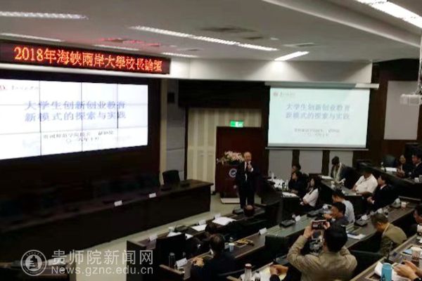 郁钟铭一行五人23日抵达台湾海洋大学,24日参加了校长论坛开幕式,聆听了山东省高等教育学会会长范跃进的《中国大陆“双一流”建设解读》报告、台湾高等教育评鉴中心基金会会长黄荣兴的《台湾高教的困境、转型与创新》报告,以及两岸十余位校长关于当前高等教育发展愿景的演讲。10月25日,郁钟铭在校长论坛上做了《大学生创新创业教育新模式的探索与实践》的主题报告。他紧扣加强创新创业、推进高等教育改革的论坛主题,提出创新创业教育必须有明确的目标体系、系统的课程体系、可操作的实践体系、能评价的服务体系、可持续的科研体系以及有效的保障体系。他针对高校双创教育中存在实效性不强、专业教育与实践联系不紧密等问题,介绍了贵州师范学院利用平台驱动、项目引领、以赛促学、院系参与等方式开展双创教育的做法,展示了我校双创教育与专业教育相结合所涌现出的各种创新成果和创业实绩。他认为,创新教育是提高学生创新创业意识、提高人才培养质量的有效途径。他表示,贵州师范学院将进一步提升教师的双创能力,进一步完善专业建设中的双创素质教育体系,以培育更多有双创思维的教师与学生。郁钟铭的演讲赢得与会者的热烈掌声,得到两岸校长的一致好评。