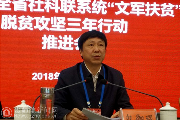 本网讯 为深入推进贵州省深度扶贫地区扶贫攻坚行动,充分发挥“文军”助推扶贫攻坚的重要作用,推动全省哲学社会科学事业在习近平新时代中国特色社会主义思想引领下创新局面、谱写新篇章。11月8日至9日,全省社科联系统“文军扶贫”脱贫攻坚三年行动推进会在中国凉都六盘水市召开。省社科联党组书记、副主席包御琨,六盘水市委常委、宣传部长、社科联主席刘睿,省社科联党组成员、副主席刘宗严,省社科联党组成员、秘书长刘丰泉,省社科联巡视员宋健等领导出席会议。各市州、省属学会(协会、研究会)、高校社科联负责人及我校科研处处长王平瑞、非物质文化遗产研究中心相关工作人员近100人参会。会议由刘宗严主持。